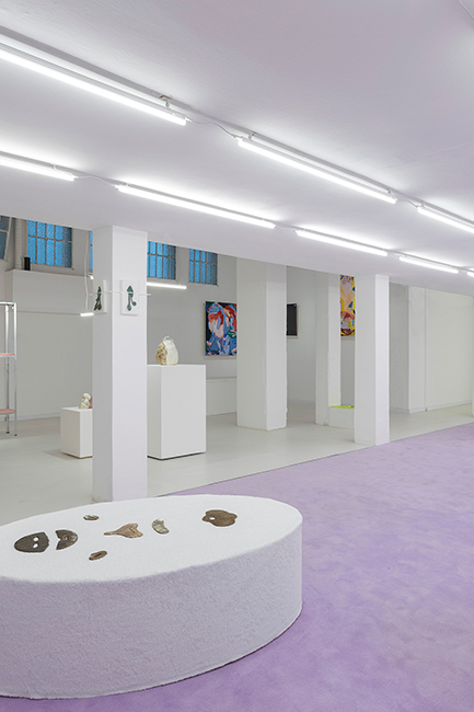 I move towards a steel shelf, attracted by the orderliness with which I can see colourful items are displayed on it: minerals of different shapes, sizes and hues. The vivid, bright colours of the objects, together with the pink surface on which they sit, are enhanced by the light coming from above, from small lighting fixtures attached to the top of the structure.