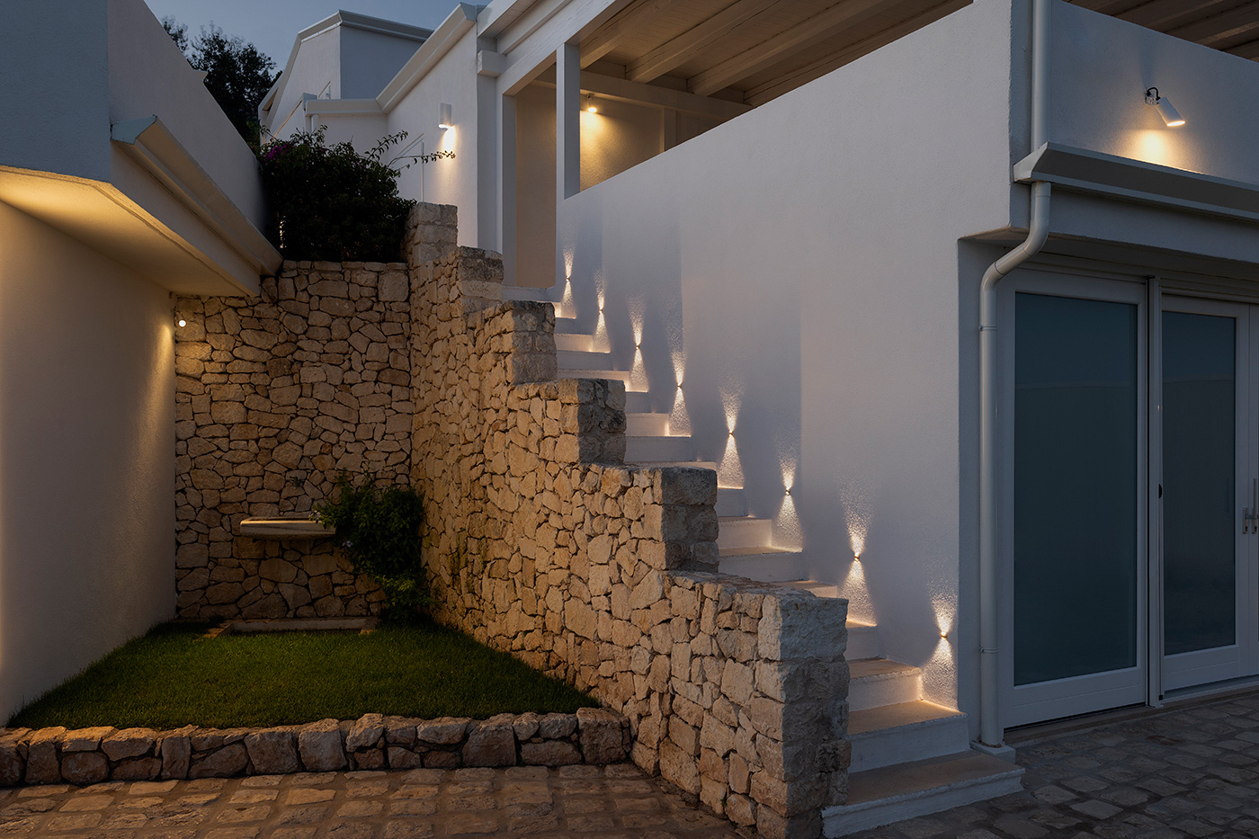 The entrance to the house is marked by two staircases located on either side of the building: the one closer to the garden area is lit with Bright 1.B, in a double-beam version with 60° radial optics, and single-beam wall-mounted Intono 3.1 fixtures, chosen with asymmetrical optics to perfectly light the landings.