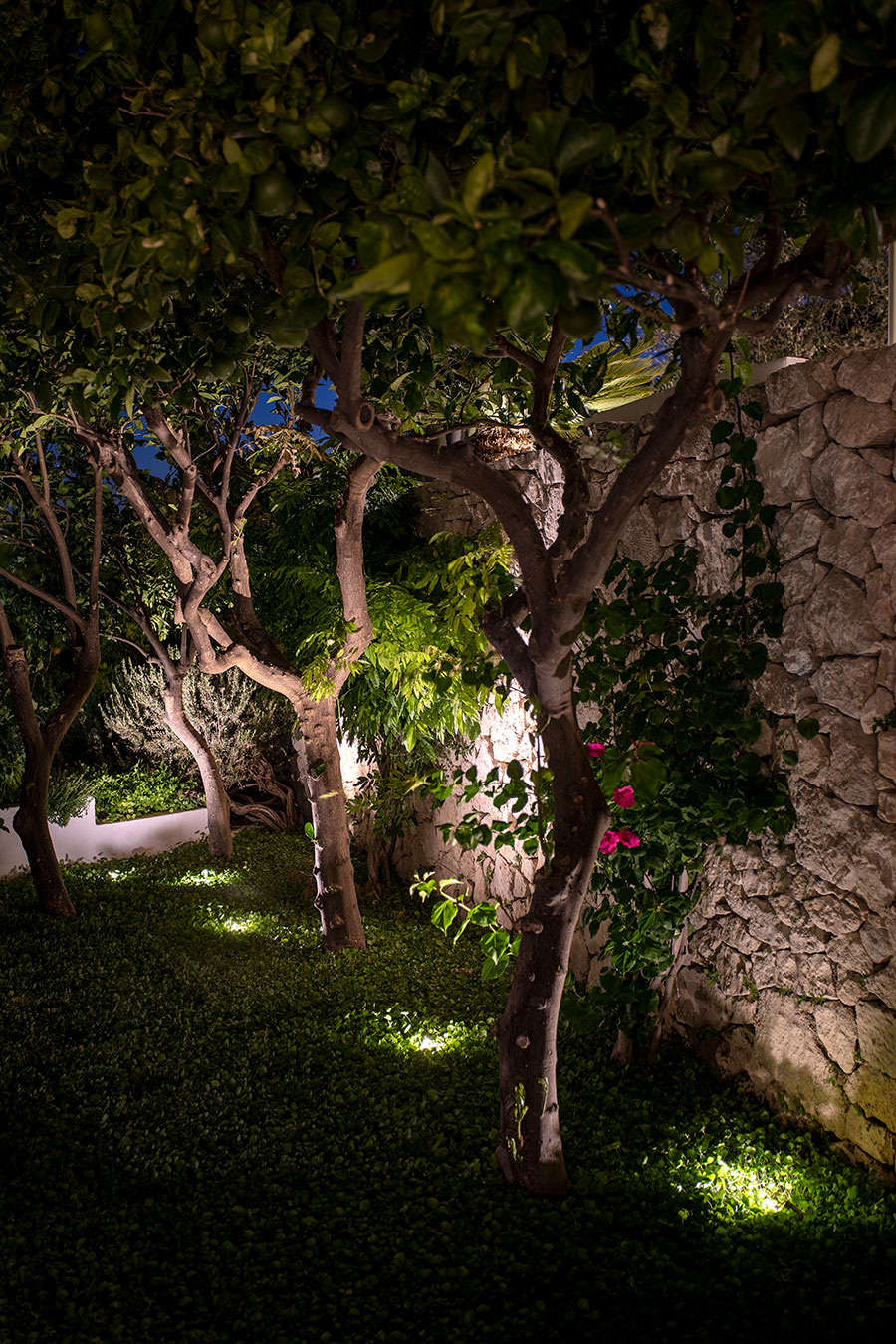 The other flight of stairs sees the use of Pasito Mini 1.2 step lights, with a white finish and 150°x90° asymmetrical optics; recessed in the niches of the boundary wall are Smoothy 1.6 diffuse-light recessed fixtures. The lighting project also encompasses the guest annexes and the terraced garden: Intono 3.1 wall-mounted fixtures have been employed for these areas, too, in a continuation of their use on the staircase, together with small Spot 1.6 stainless steel projectors with 40° optics, positioned in the flower beds to light the succulents, aloes and dwarf palms that punctuate this large garden.