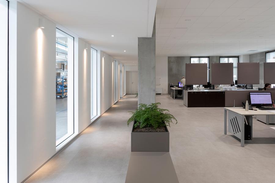 The lighting design plays a key role both indoors and out. In the reception area, it involves the use of Berica IN 3.2 wall-mounted fixtures with diffuse optics and Cameo 2.7 recessed fixtures with 32° optics. The corridors and customer-facing areas are lit by Combina D recessed fixtures. The same fixtures have been used in the snack area – some with a customized shadow-effect filter that breaks up the uniformity of the walls with the dappled effect of light shining through foliage, while others use the honeycomb louvre accessory, to maximise visual comfort and create a more relaxing atmosphere. Connecting the offices to the production area, a long corridor runs the whole length of the open office space. Its large glass windows overlooking the production spaces alternate with Intono 2.1 wall-mounted fixtures, 3000K, with 11° narrow optics. The latter’s white finish blends into the wall, leaving only their light output visible.