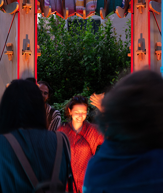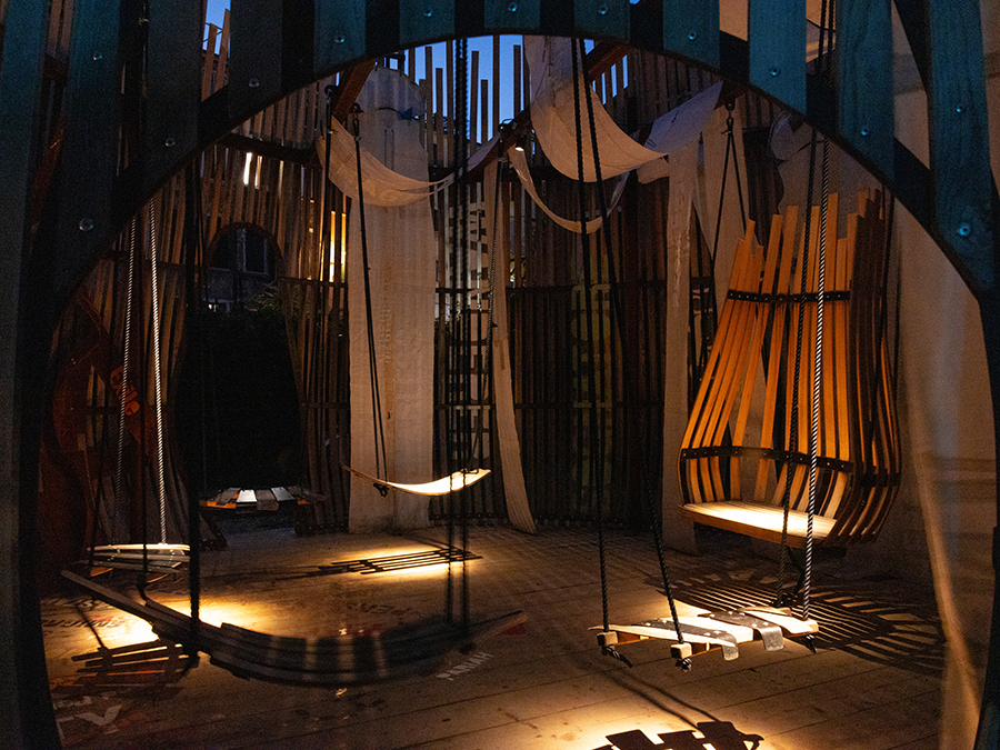 La cabane invite à s’interroger sur l’usage discriminatoire du langage envers les migrants et les personnes en situation de pauvreté. Sa peau extérieure, uniforme et rigide, contraste avec un intérieur chaotique et changeant, suscitant une réflexion sur la société et ses contradictions. À l’intérieur, des balançoires suspendues impliquent physiquement les visiteurs, transformant l’espace en une expérience méditative et multisensorielle qui mêle mouvement, regard et perception.