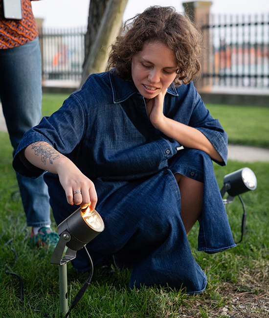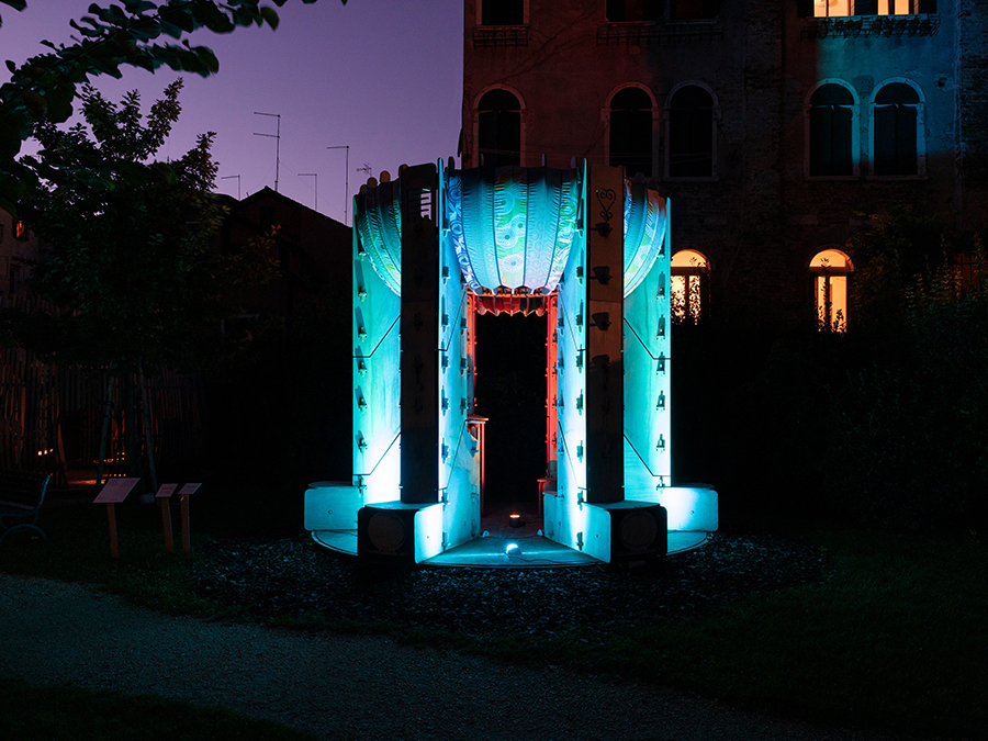 L’éclairage accompagne le parcours des visiteurs de manière narrative: des projecteurs Reiko illuminent l’extérieur de la structure, diffusant une lumière douce sur la peau extérieure, tout en sublimant la texture et la forme de la structure, tandis que des Ginko, disposés à l’intérieur, s’allument au mouvement des balançoires, afin de souligner les dynamiques de l’espace et la relation entre objets, personnes et lumière.