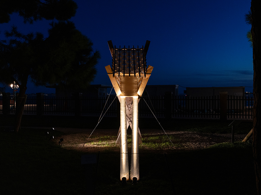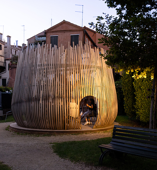 Une cabane en bois qui dialogue avec les pins maritimes penchés des Jardins de la Marinaressa, exploitant leur inclinaison naturelle comme élément à la fois structurel et conceptuel. La structure, à géométrie angulaire, se développe sur plusieurs niveaux et intègre des passerelles intérieures, tandis que les panneaux tressés forment le feuillage qui filtre la lumière naturelle et crée des jeux changeants d’ombres et de perspectives. La combinaison de poutres inclinées, d’éléments de soutien et de panneaux légers confère à l’ensemble un dynamisme qui invite les visiteurs à explorer l’espace.
