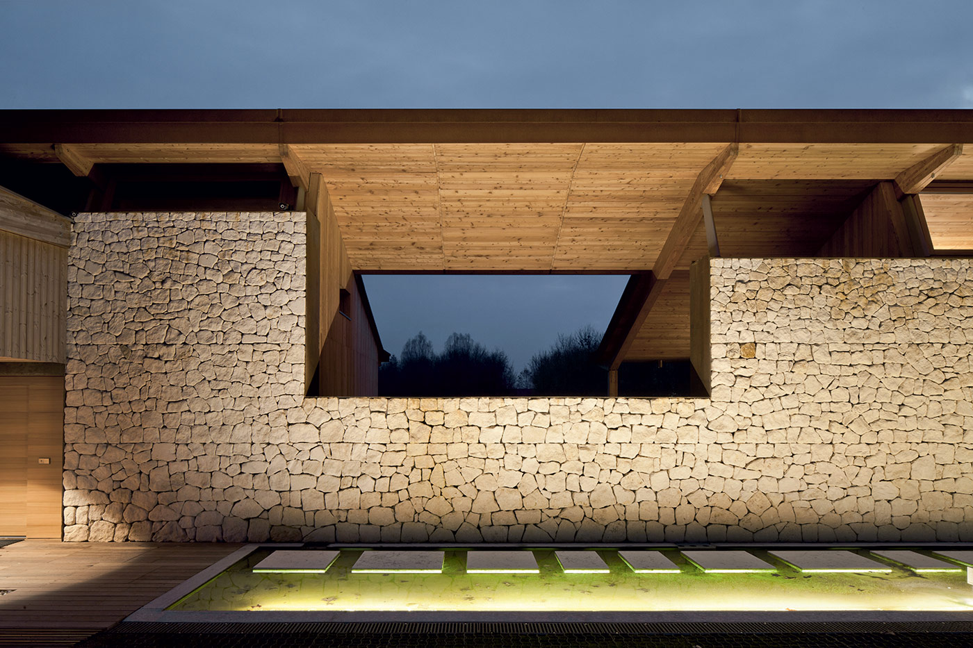 L’illuminazione degli spazi esterni è stata progettata per interferire il meno possibile con l’oscurità notturna dell’ambiente agricolo: il Beam 2.0 scandisce il viale d’ingresso, mentre Trevi è integrato nel grande specchio d’acqua della corte per far risaltare la lunga parete in sasso locale.