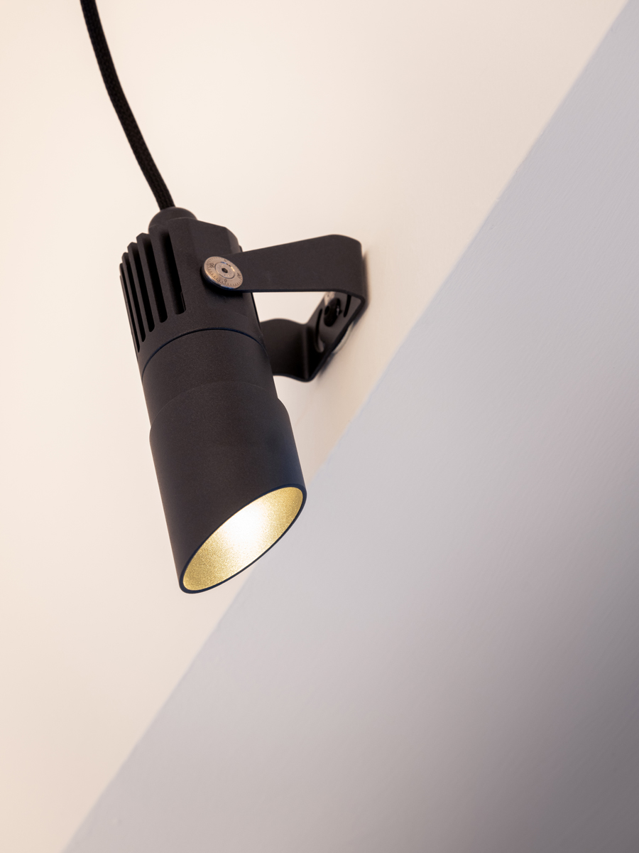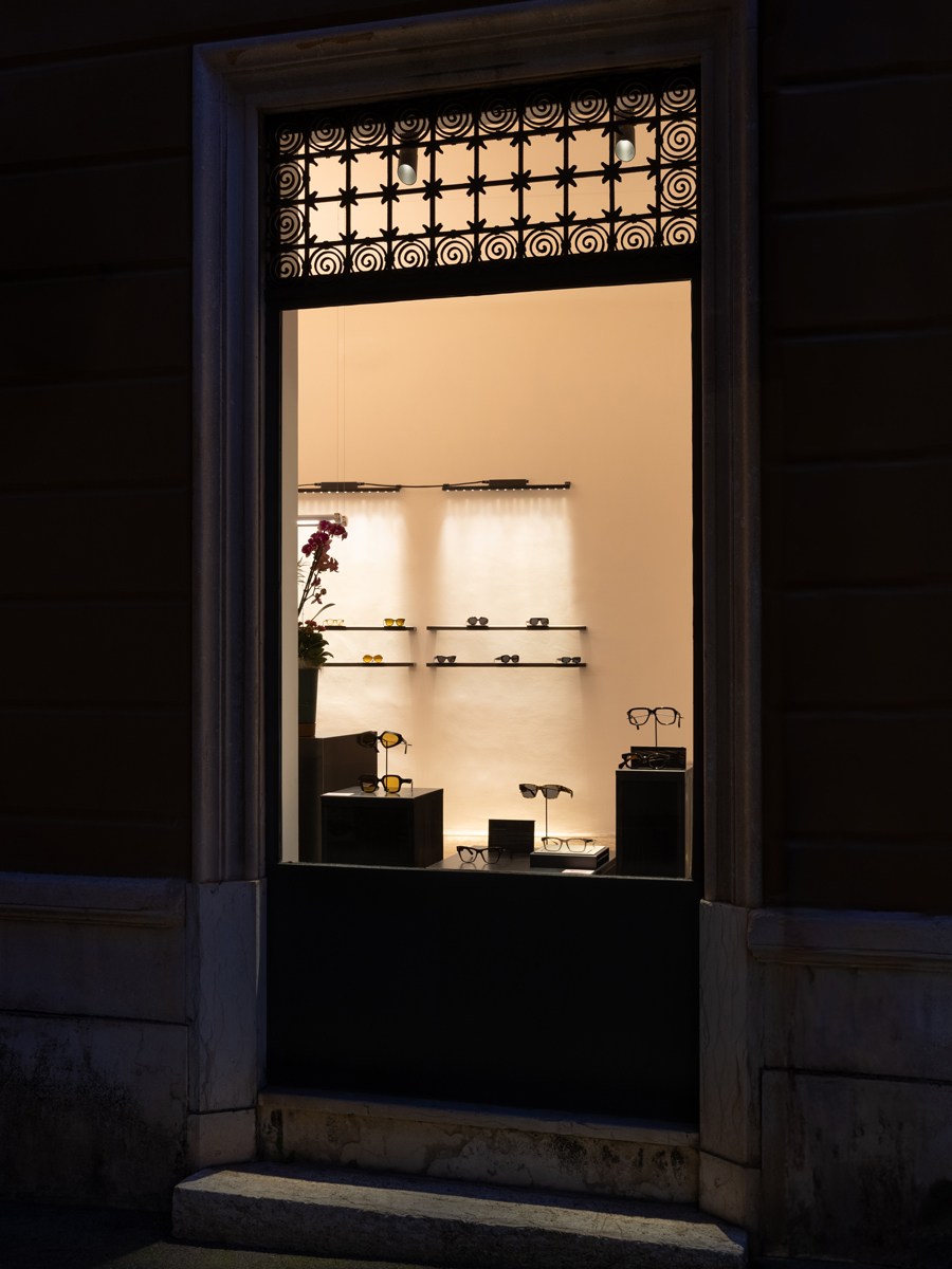 Витрины магазина освещаются прожекторами Flori 1.0 с цветовой температурой 2700K в антрацитовой отделке, гармонирующей с оконными рамами. Узкая оптика 9° в сочетании с асимметричным тубусом snoot обеспечивает точечное освещение и эффективный контроль ослепления.