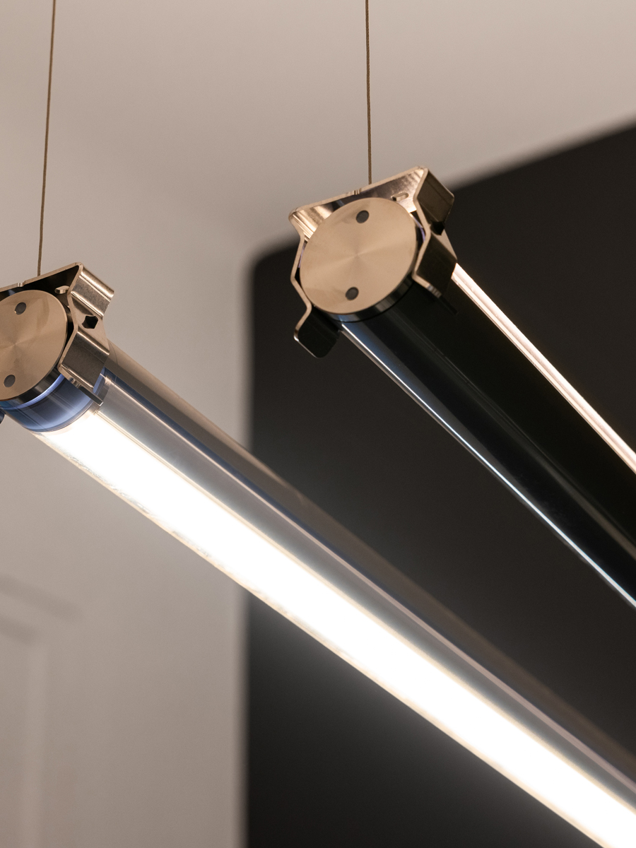 Над прилавком размещены три пары подвесных профилей Trevi 2.2, создающих ритмичную световую композицию. В каждой паре один светильник с температурой цвета 2200K направляет тёплый, мягкий, рассеянный свет вверх, тогда как второй, с температурой цвета 3000K, направлен вниз, обеспечивая функциональное равномерное освещение экспозиционных пространств.